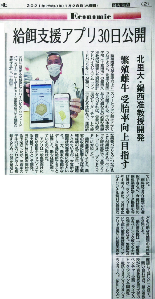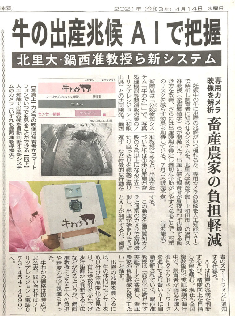 北里大学獣医学部 動物飼育管理学研究室(青森県十和田市)、ノーリツプレシジョン株式会社(和歌山県和歌山市)、ライブストックジャパン合同会社において、画像認識AIで牛の分娩兆候を非接触で検出して飼養者へ通知するシステム『分娩検知システム(牛わか)』を開発・製品化。2021年7月1日に、ノーリツプレシジョン株式会社から発売される予定です。https://livestockjapan.com/ushiwaka/
