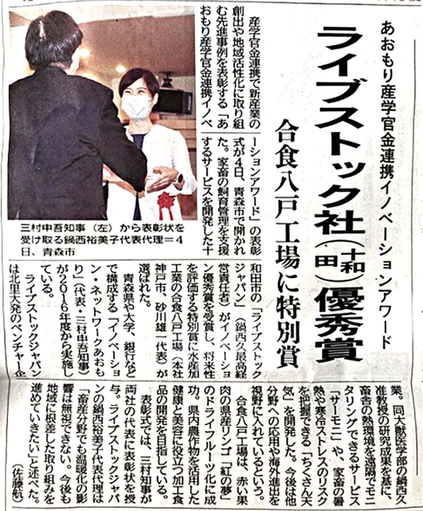 あおもり産学官金連携イノベーションアワード2021優秀賞受賞に際してこの度、名誉ある「あおもり産学官金連携イノベーションアワード2021」優秀賞を頂くことになりました。今回の受賞に際しまして、関係者の皆様方に対して、厚く御礼申し上げます。