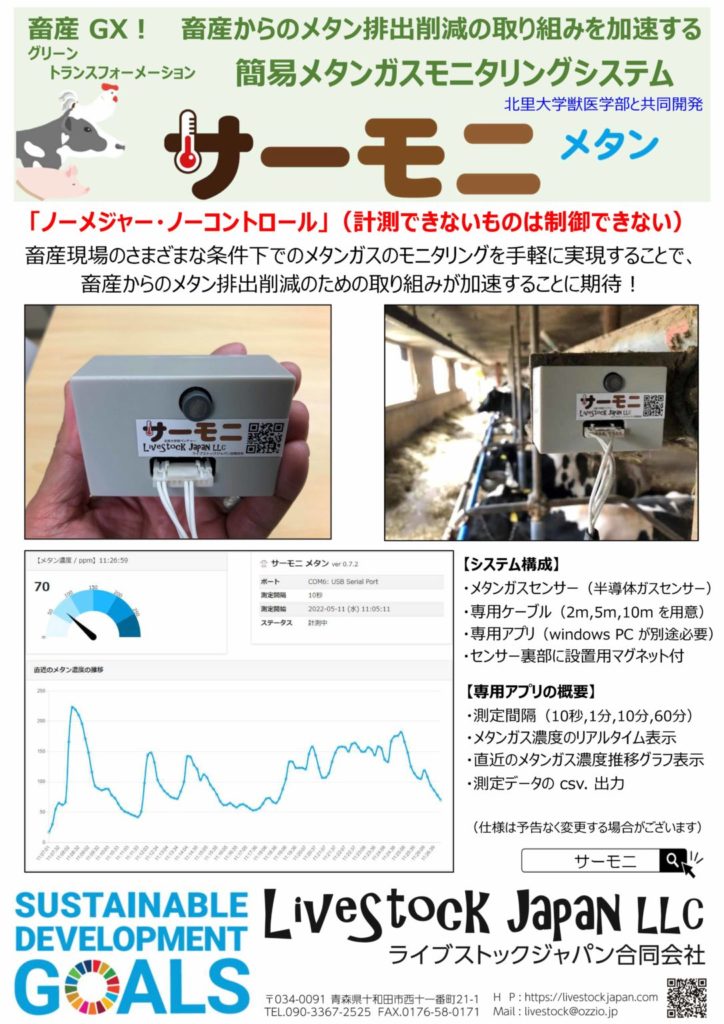 『簡易メタンガスモニタリングシステム』は、弊社がこれまでに開発、サービスを提供している 『畜舎の熱環境見守りサービス “サーモニ”』 、『畜舎の換気状況見守りサービス “サーモニ CO2プラス”』 に次ぐ “サーモニ” シリーズ製品 “サーモニ メタン”として、研究機関などを対象とした試験販売を7月1日より開始します。