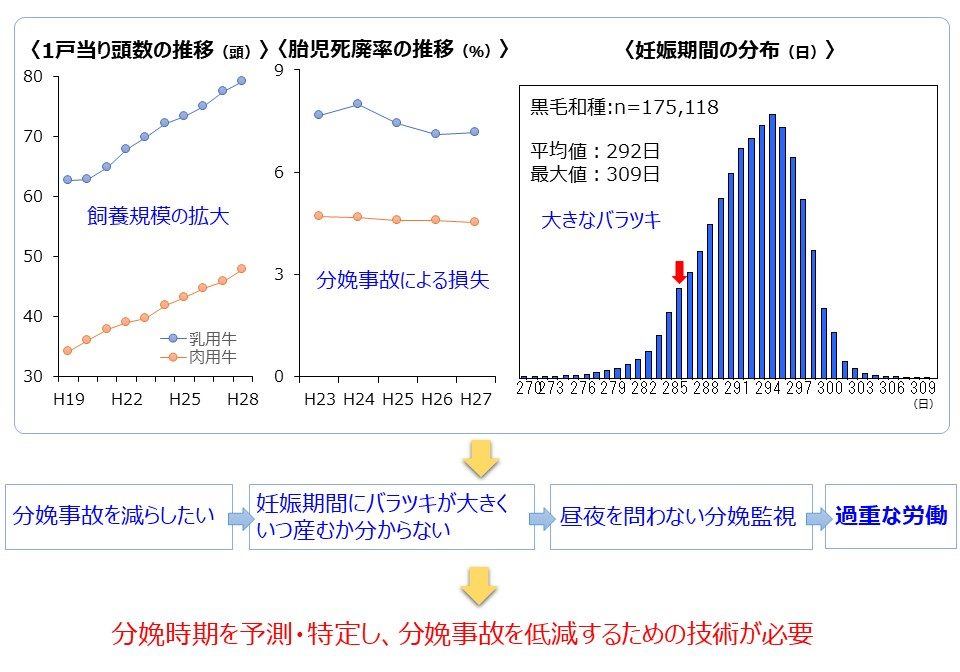 養牛農家において分娩時の死廃事故は、経済的損失や精神的ダメージをもたらす重要な課題です。近年、黒毛和種の妊娠期間は延長傾向にあるとの報告もあり、飼養者は分娩事故を防ぐために、昼夜を問わない長期間の分娩監視を強いられており、過重な労働負担が大きな問題となっています。そのため、分娩時期を特定し、分娩事故を低減するための技術が求められていました。
